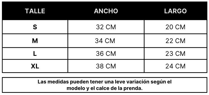 (Las medidas están tomadas con la prenda apoyada sobre una superficie plana, sin estirar)
